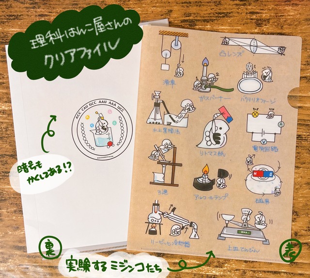 一般的なA4サイズのクリアファイルです。 表面には色んな実験をするミジンコ 裏面にはビーカーに入ったミジンコ(暗号が隠されているので解いてみてください。) が描かれています。